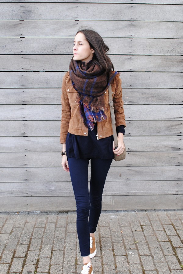 I created a look that I personally love. In it I mix two colors with great force and personality, brown and navy. The scarf serves as a link between the two colors. Hope you like it as much as me, why’ll have a happy day!.
