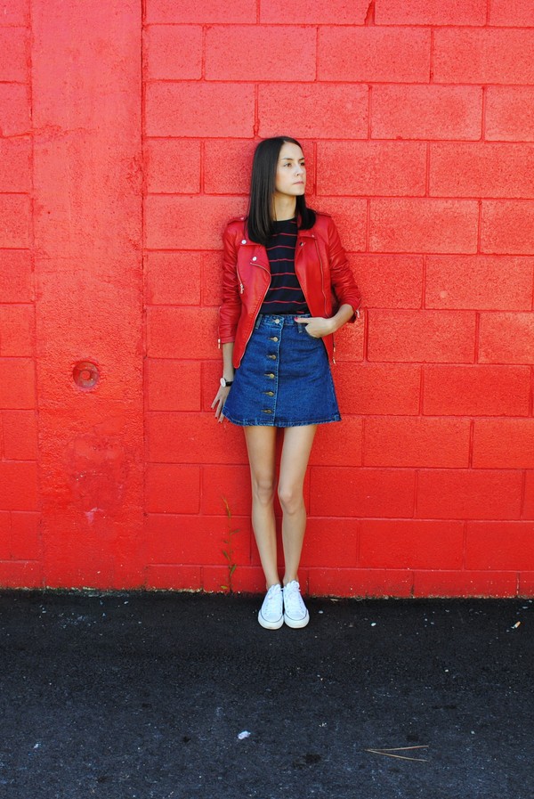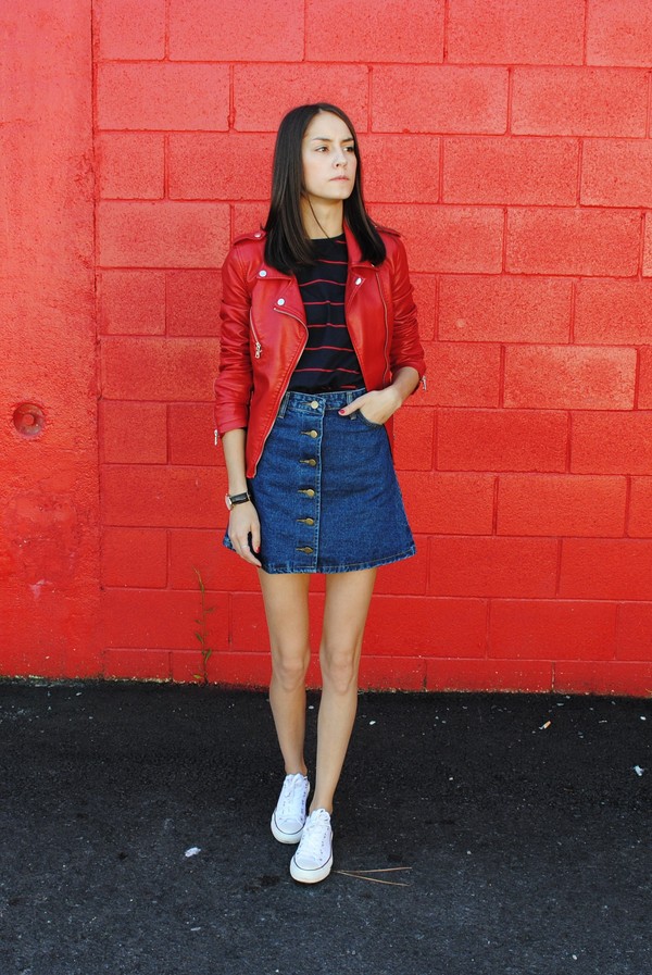 me encanta guapa, queda genial la falda vaquera con la biker y las deportivas!!! 🙂