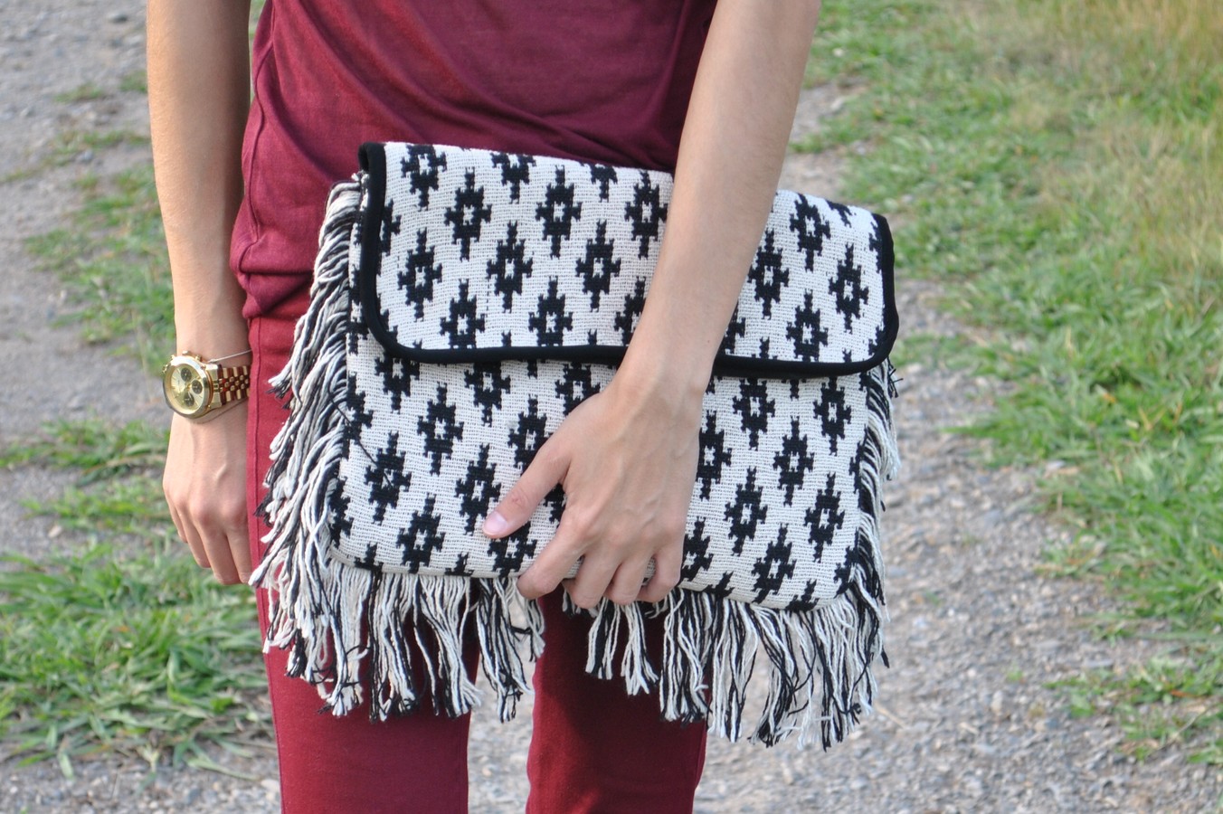 El granate es uno de mis colores favoritos, lo ha sido siempre y desde la temporada pasada más todavía. Es un tanto otoñal pero bueno, ejem ejem, Galicia, ya sabéis!jaja. Me parecía un look sencillo y con el toque chic de las sandalias romanas, pero fui más allá y para rematarlo usé el clutch de estampado étnico, ¿qué os parece el resultado?.