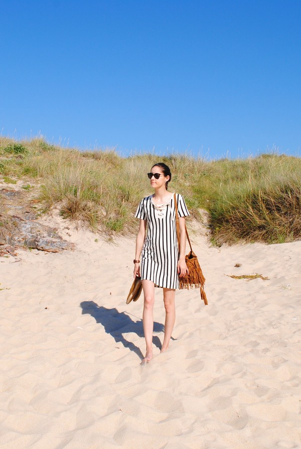 Wear dress with lacing trend chest, simple and cool. I decided to completely break with the color gamut of it and go for supplements in brown, and so give it a boho touch that I like for this time of year. In addition the fabric suede fringed bag and accentuate this trend and bring character to the whole.
